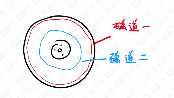 下圖是一個(gè)磁盤盤片,在外圈選一圈磁道,在內(nèi)圈選一圈磁道,我們就得到兩個(gè)圓形的磁道。先叫它們磁道一和磁道二吧。