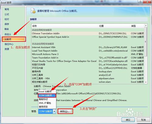 然后切換到“加載項”標簽,右側底部管理一項中,選擇“COM加載項”,然后點擊“轉到”。