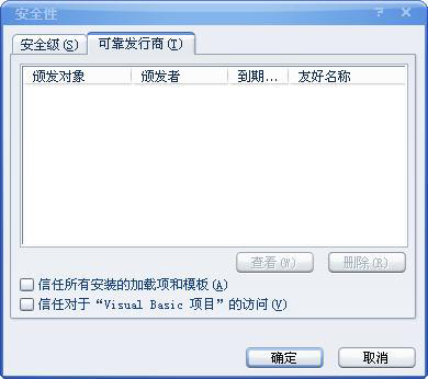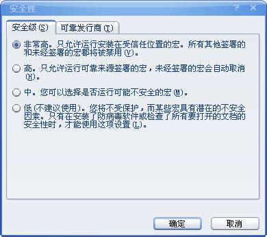解決方案:啟動Word,選擇“工具->宏->安全性”,將“安全級” 調到“非常高”,轉到“可靠發行商”,將所有來源都刪除,取消選擇底下2個選項,點擊確定完成。